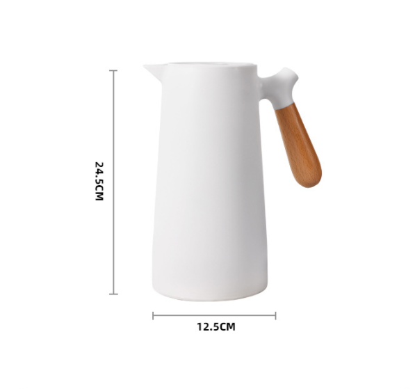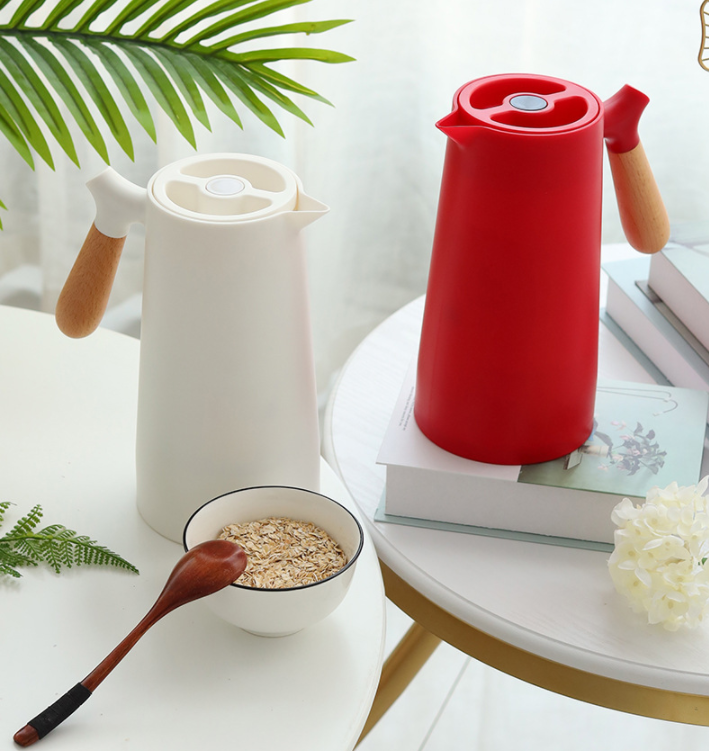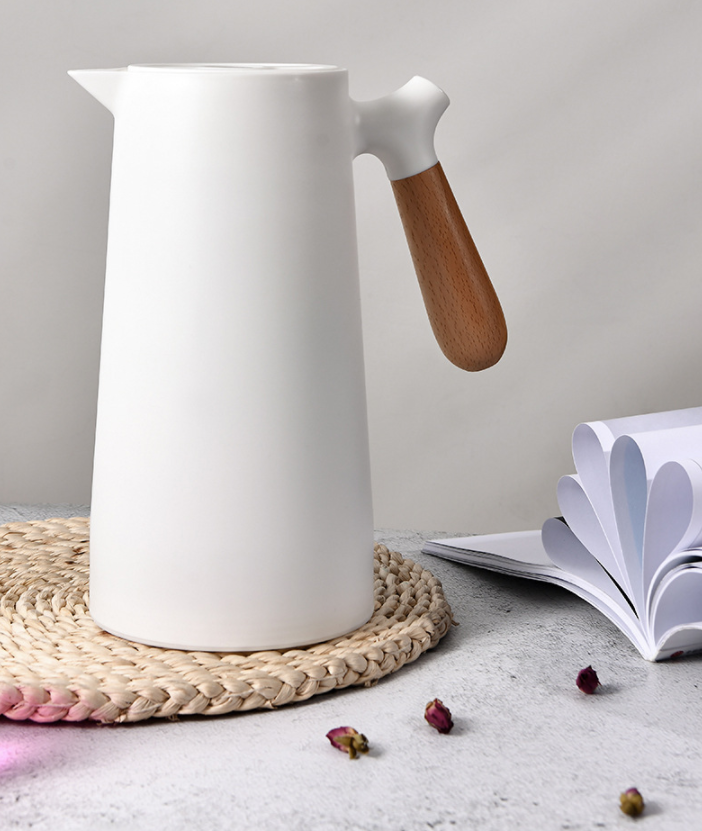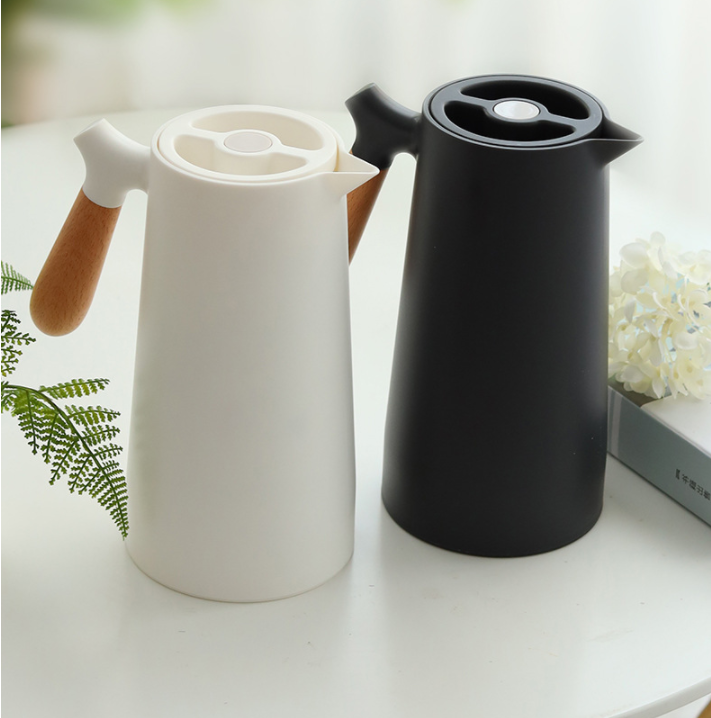 This insulated kettle is designed to store and serve hot or cold beverages for everyday use. It features a glass inner liner housed in a durable plastic outer case, along with a wood-style handle for comfortable pouring. Suitable for home, office, or tabletop use.